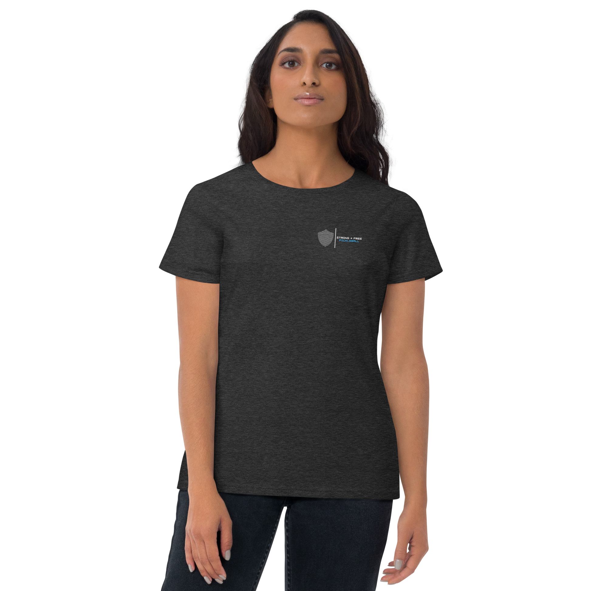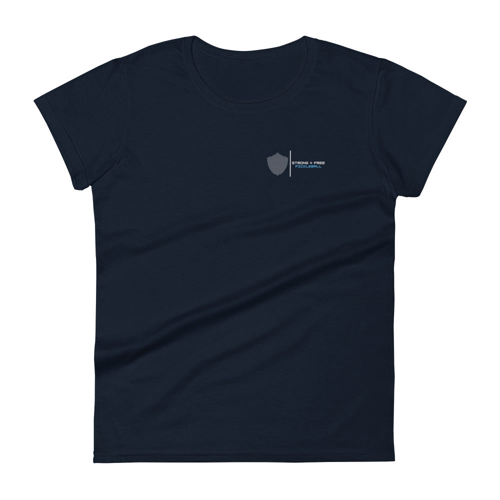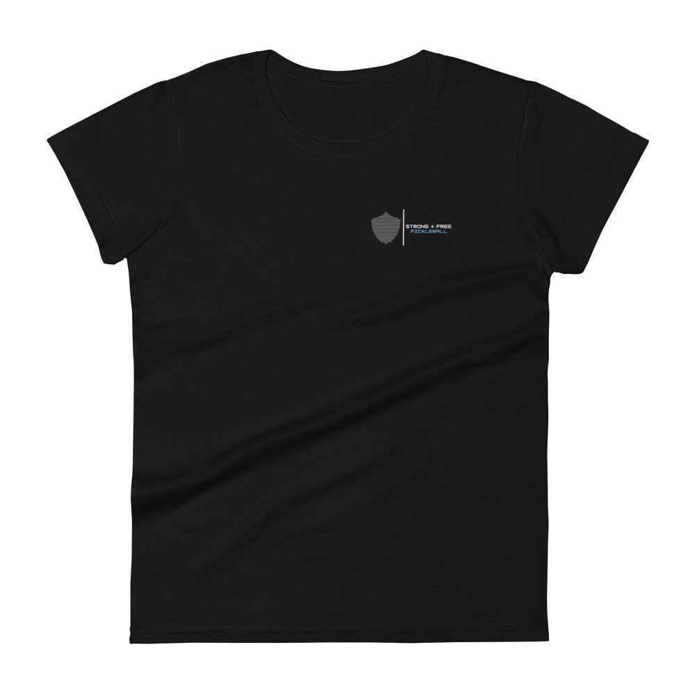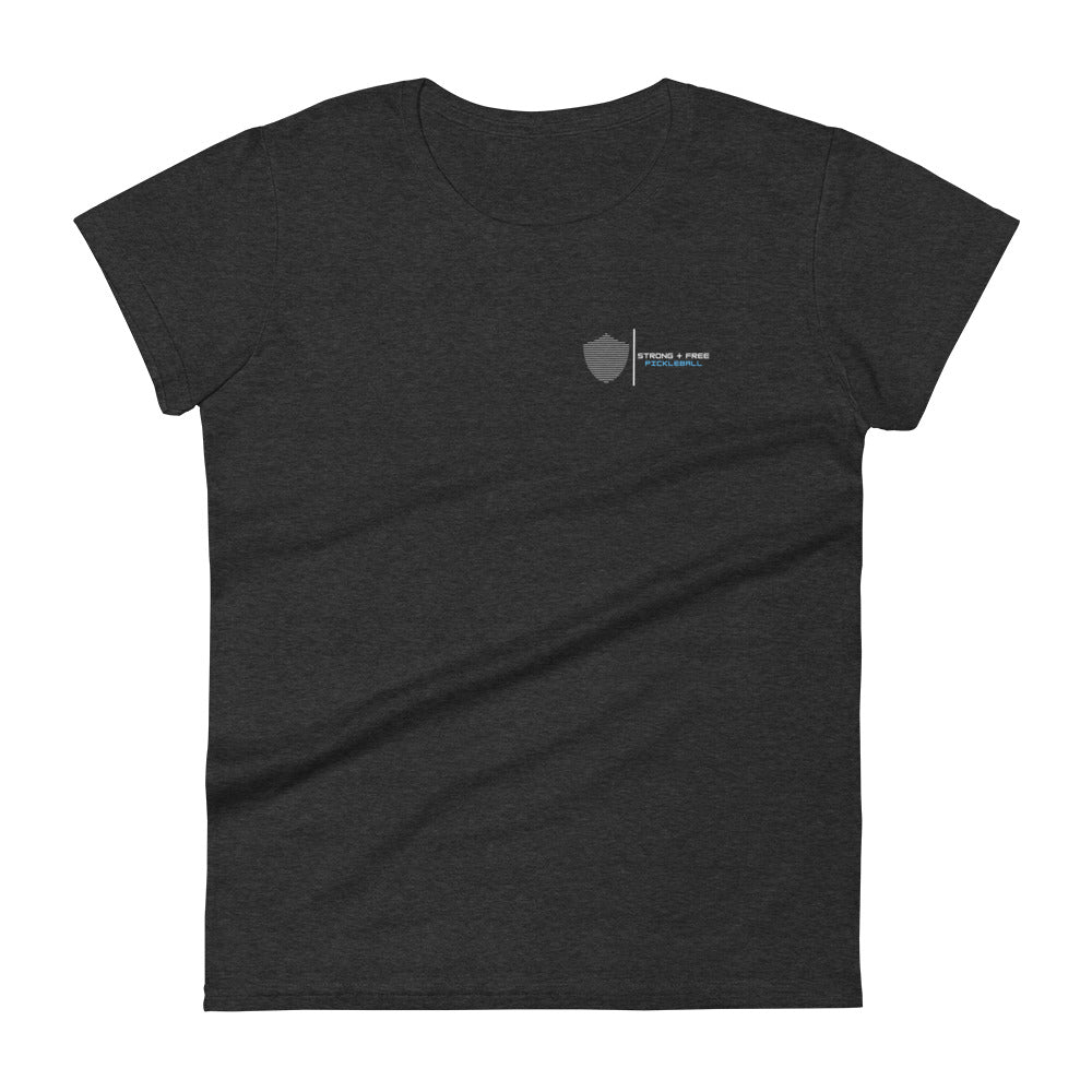Women's short sleeve t-shirt, black/navy/grey colors. S+F signature shield logo design II.